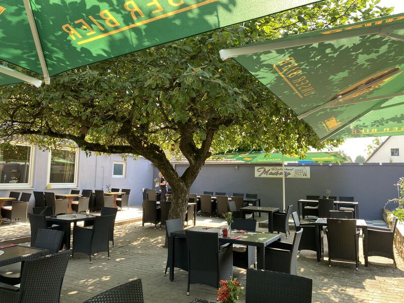 Unsere Gäste schätzen besonders unseren wunderschönen Biergarten, der perfekt für entspannte Stunden im Freien ist. Hier können Sie an warmen Tagen unter schattigen Bäumen sitzen und die griechische Gastfreundschaft in vollen Zügen genießen. Für diejenigen, die mit dem Auto anreisen, bieten wir selbstverständlich kostenlose Parkplätze direkt vor Ort an.